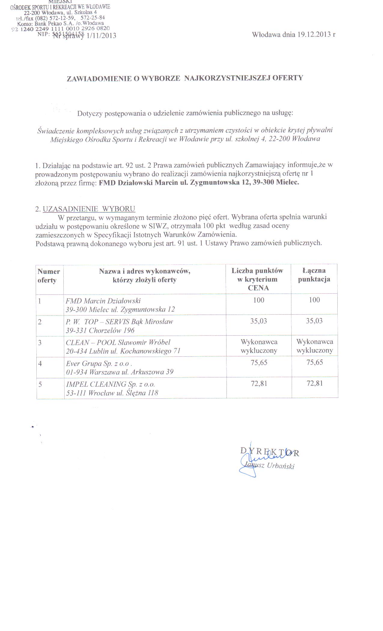 powrót do listy przetargówŚwiadczenie kompleksowych usług związanych z utrzymaniem czystości w obiekcie krytej pływalni Miejskiego Ośrodka Sportu i Rekreacji we Włodawie przy ul. Szkolnej 4, 22-200 Włodawa